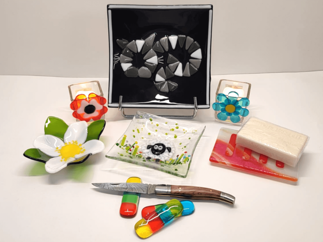 Chaque pièce que je crée dans mon atelier à Millau (Aveyron) est née de la technique du fusing : le verre est découpé, assemblé, superposé, puis fusionné dans mon four à haute température pour donner vie à des bijoux uniques et objets décoratifs pleins de poésie.